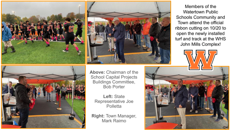 On Friday, October 20 at 5:30 PM the Watertown Public Schools officially opened the brand new John Mills Complex turf and track. Attended by members of the School Capital Projects Building Committee, Town Council, Board of Education, State representative Joe Polletta and Senator Eric Berthel, the group gathered to cheer on the Watertown High School Warriors as they prepared for several contests.
