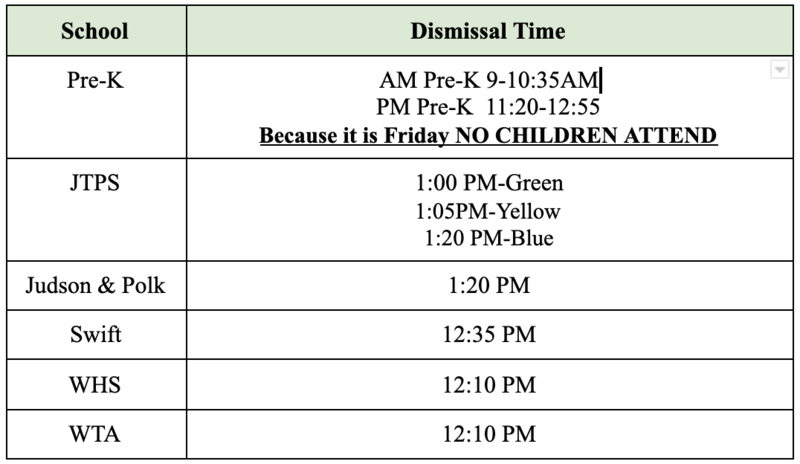 1. Tomorrow, Friday August 27, 2021 will be an Early Dismissal Day for all Watertown Public School students and faculty due to the current heat and humidity indexes. School offices and the Board of Education offices will remain open all day tomorrow. This means, students will be dismissed according to the Early Dismissal schedule.