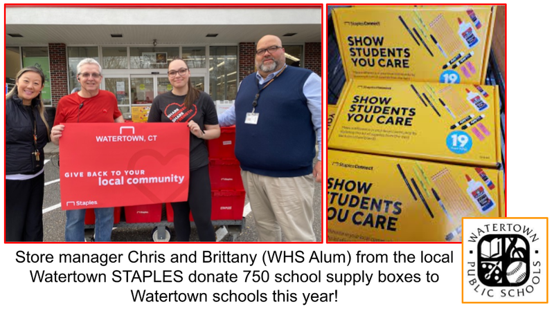 The local Staples in Watertown, CT once again provided school supply boxes to the Watertown Public Schools. Over the past few years, STAPLES across the nation have been donating school supplies to local districts through the pre-made boxes filled with basic school necessities like pens, pencils, crayons, erasers, highlighters and glue.