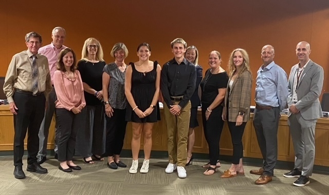 L to R: BOE Members J. Gavallas, D. Martin, L. Phelan, C. Faressa, K. Hosking, Student council representative Margaret Dassatti, Colin Krayeske, Dr. V, C. Hllian, E. Lawton, J. Malagutti, and Principal Perugini.