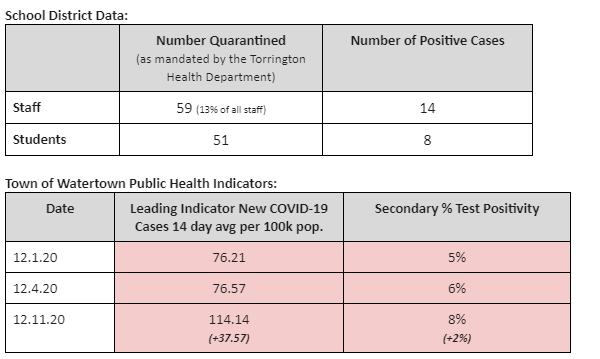 The Watertown Public Schools Central Office will be closed to visitors until Monday, December 28 because of the need for Central Office staff members to quarantine. Please call the Central Office Main Number at (860) 945-4800 to leave a message if you have a question or concern.