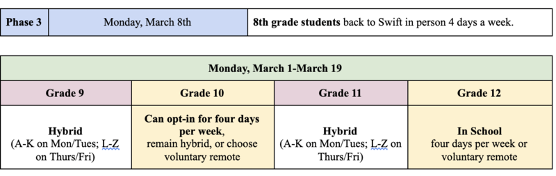 On Monday, March 8th, we are all looking forward to the final phase of having our Swift 8th graders return fully in person. If you haven’t completed your school’s survey on choosing your learning model, click the links and see the schedule below. WHS will continue their current rotation until March 19.