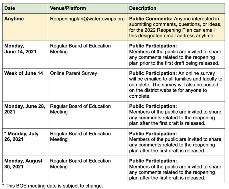 Over the course of the summer, the Watertown community will have several opportunities to provide public input to help inform the creation of the reopening plan. Please see below for opportunities to share your ideas. I invite any member of the Watertown community, faculty and even students to reach out or share ideas using any of the methods listed below.